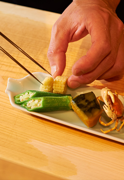 ご提供するのは、食材選びから仕込みまで、こだわり尽くした季節の逸品。手間暇かけて仕上げる自慢のお料理を、コースでご提供いたします。