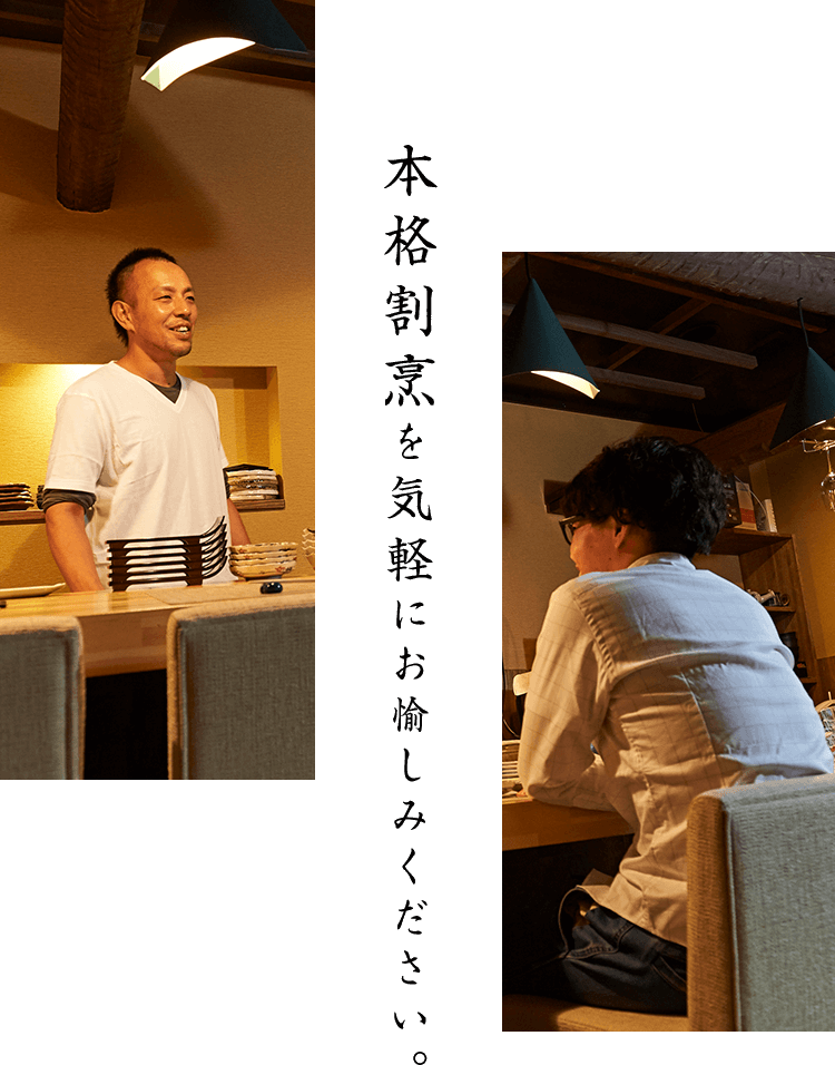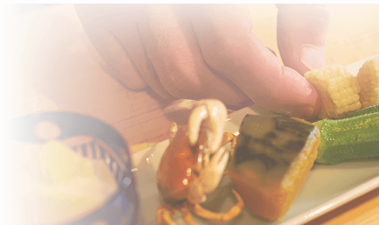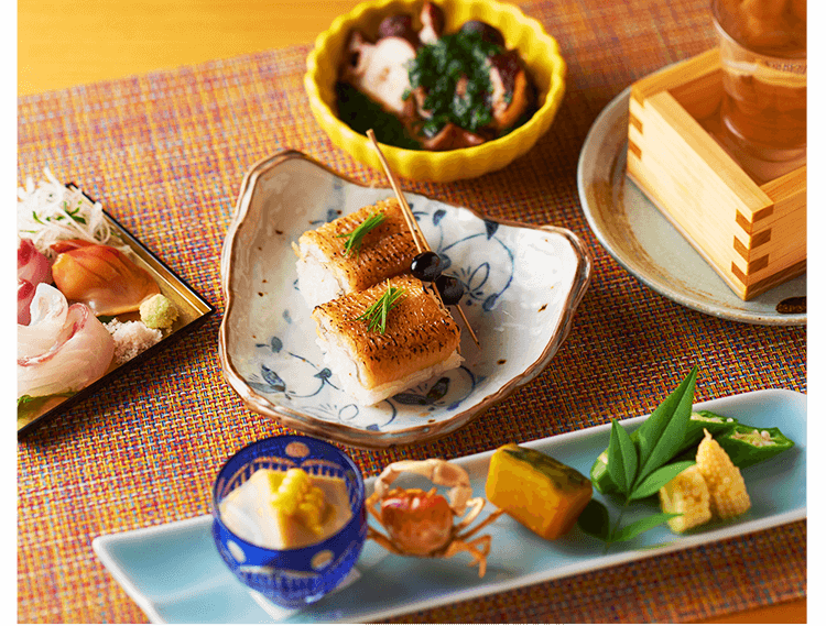 本格和食という軸は、ぶらさずに。しかし常に新しい味わいへの挑戦を忘れない当店のお料理には、感性と創造力を働かせ、驚きや発見をご提供できるように心がけています。どの食材をどのように組み合わせようか。食感や香り、彩りはどんな風にしようか。そんなことを考えながら、毎日様々な季節の逸品を考案しております。
