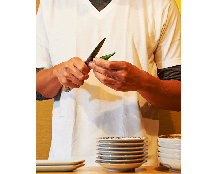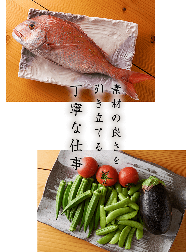 素材の良さを丁寧な仕事で引き立たせるということ。使用する食材は産地やブランドに頼るわけではなく、その日届いた素材の顔を見て、どんな料理に昇華させるかを大切にしています。厳選した旬の天然魚などの素材は、長年の経験で培った腕で、至極の一品へと変化させます。