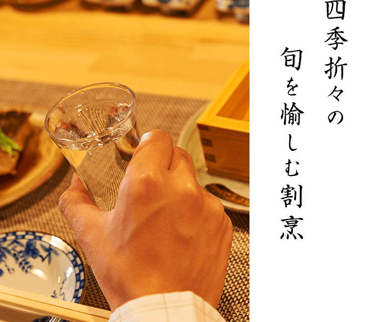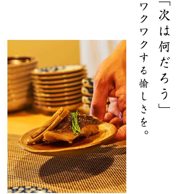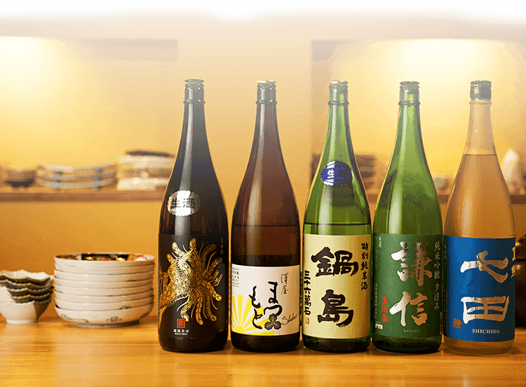 和食には、やはり日本酒が合います。「次、日本酒ちょうだい」という風に、気軽にお声がけください。お料理に合う1本をご提案いたします。常時置いている銘柄も、季節に合わせて頻繁に入れ替えている銘柄もございます。ぜひ様々にお愉しみください。