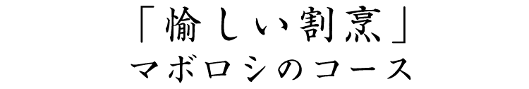 お料理は、豊かな感性と創造力を凝らし、驚きや発見で愉しんでいただける調理を心がけています。「次に何が出るんだろう。」そんなワクワク感を持てるお食事を、目の前で調理から楽しんでいただくのがマボロシ流です。常に新しい組み合わせや味わい、食感を考案し続けるため、何度ご来店いただいても新しい味わいに出会っていただけます。旬に合わせてコース内容は頻繁に変更しますので、ぜひ様々な味覚を味わいにいらしてください。